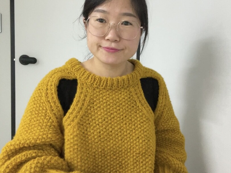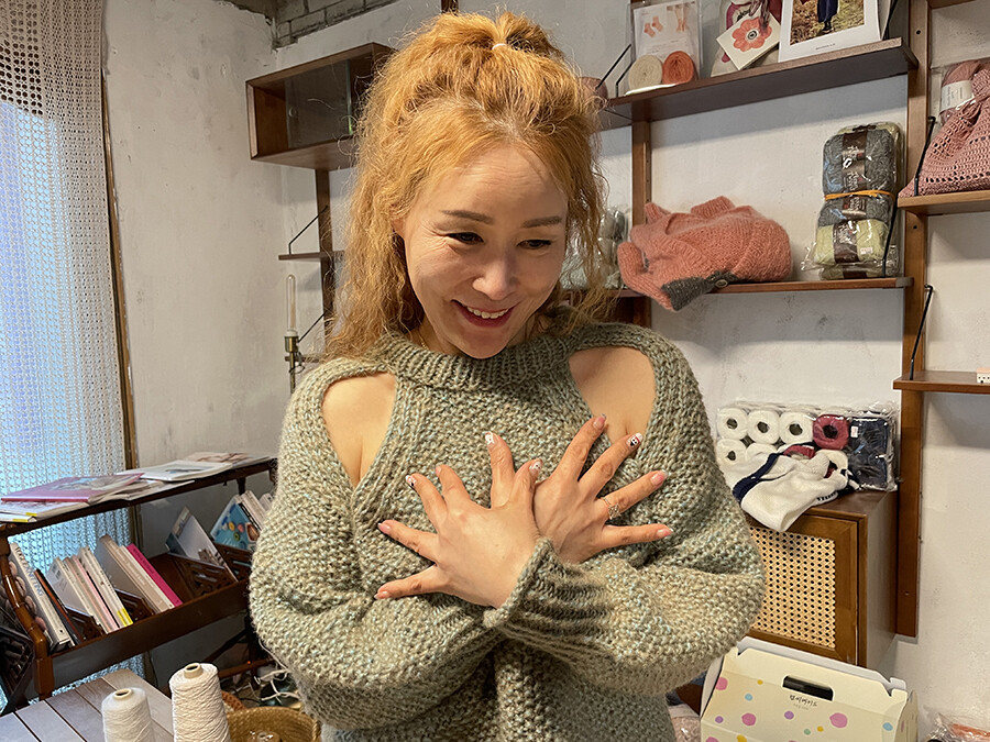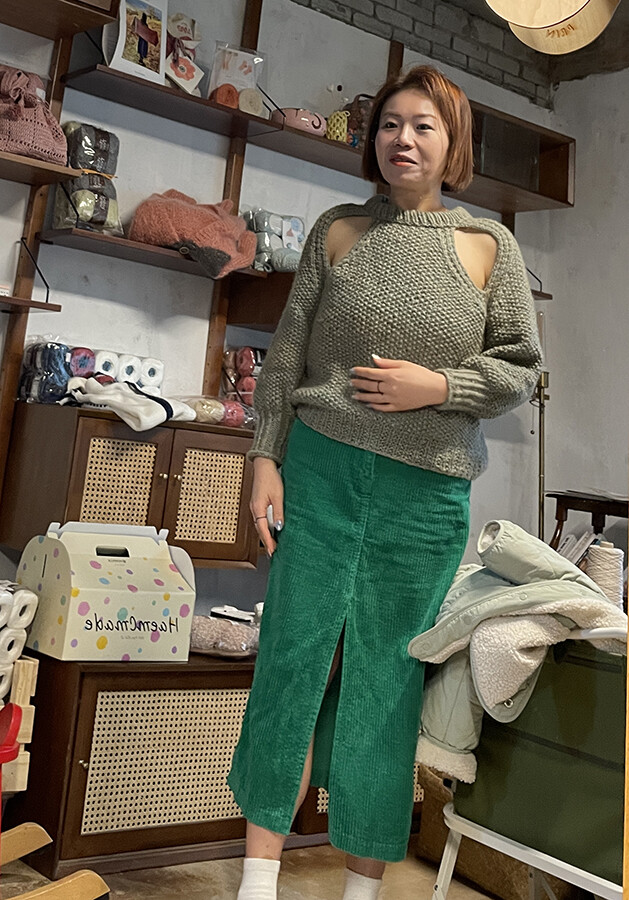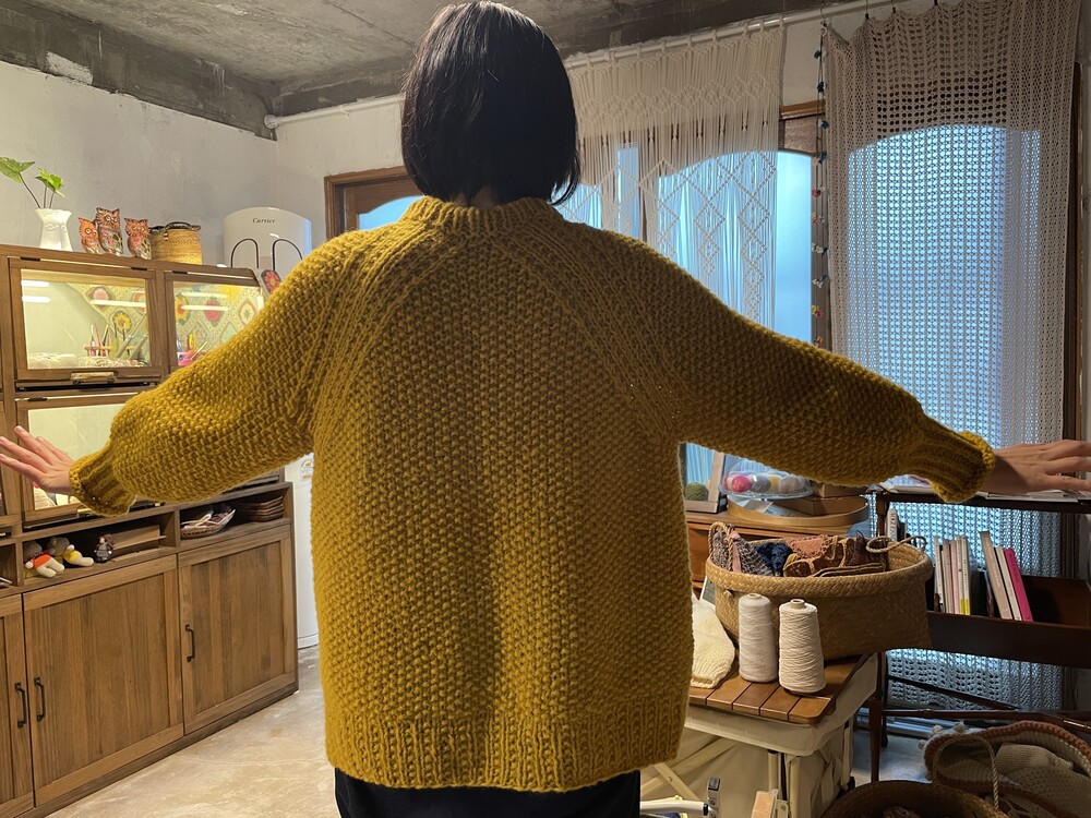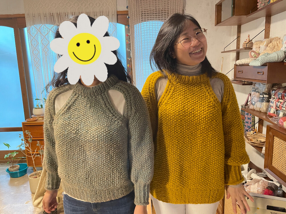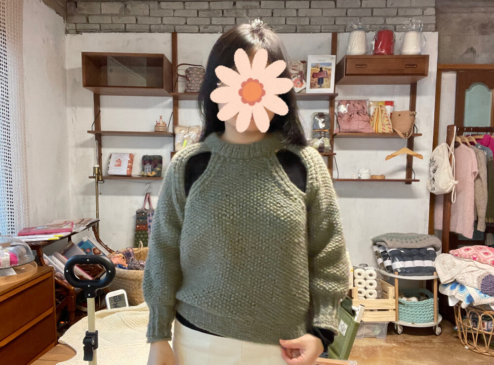 M사이즈는 수강생님이 뜨신건데 저와 마찬가지로 헐랭손이거든요. 그래서 55이하 분들이 입어야 예쁜 핏이 나올것 같아요~! 위에서 언급했던 것과 마찬가지로 소매, 기장이 좀 짧아서 낙낙한 길이로 뜨고 싶은 분들은 실 1볼 추가해주세요~