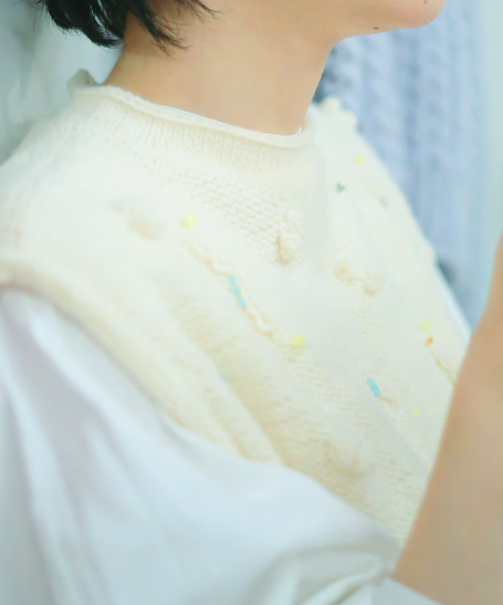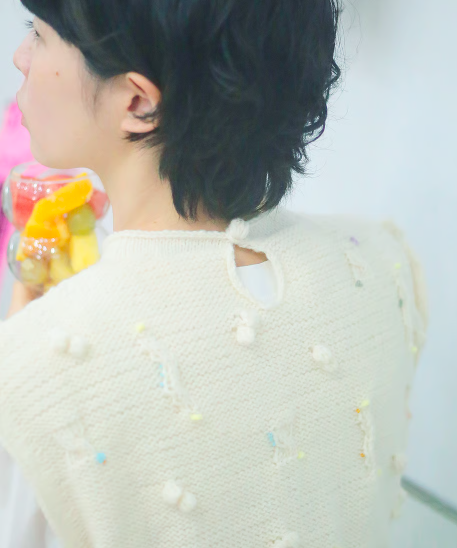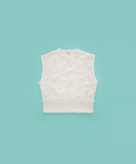 마치 리본 같은 무늬와 폼폼이 귀엽게 자리 잡은 베스트입니다.