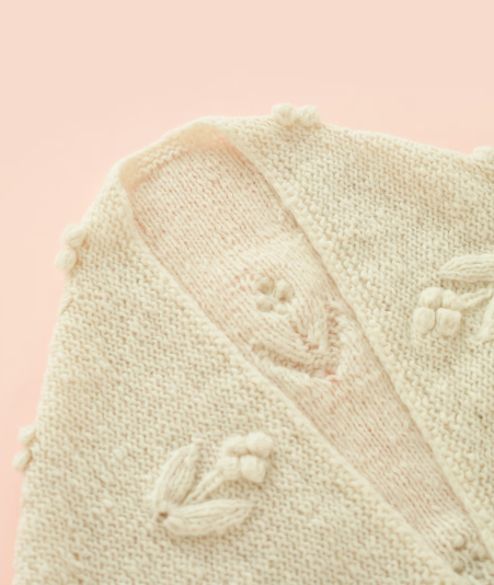 흩어져있는 꽃의 패턴과 가장자리 뜨개질의 프릴이 매우 귀엽운 디자인 입니다.
