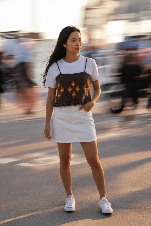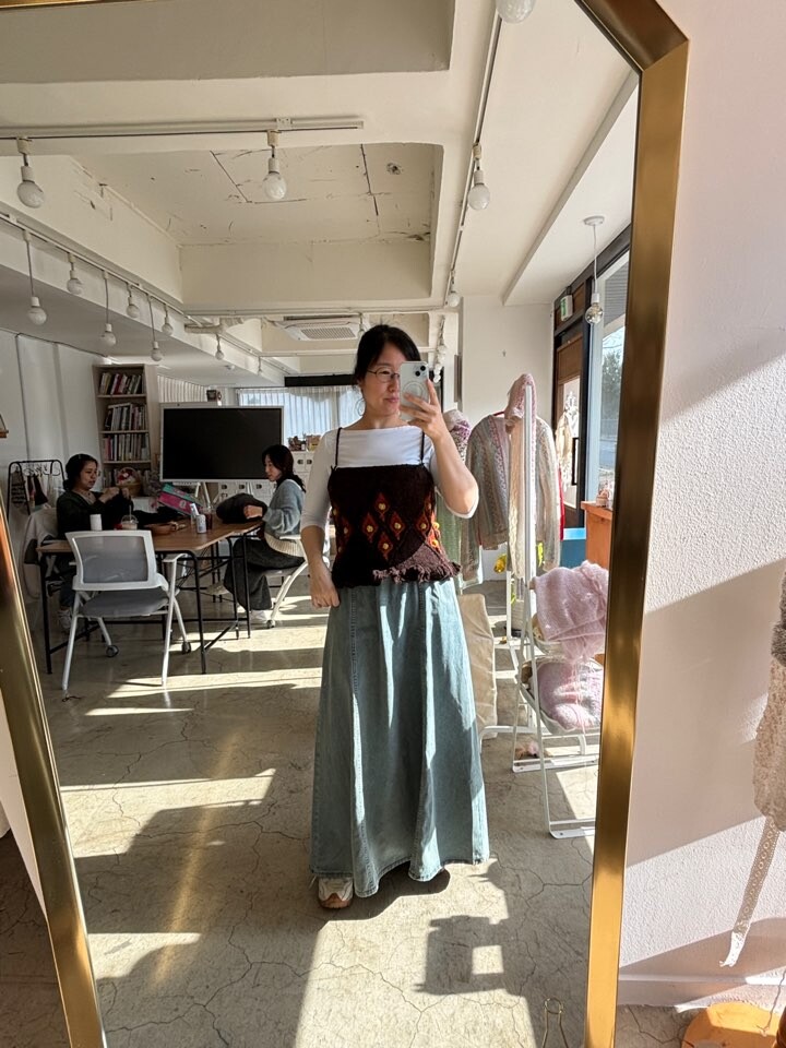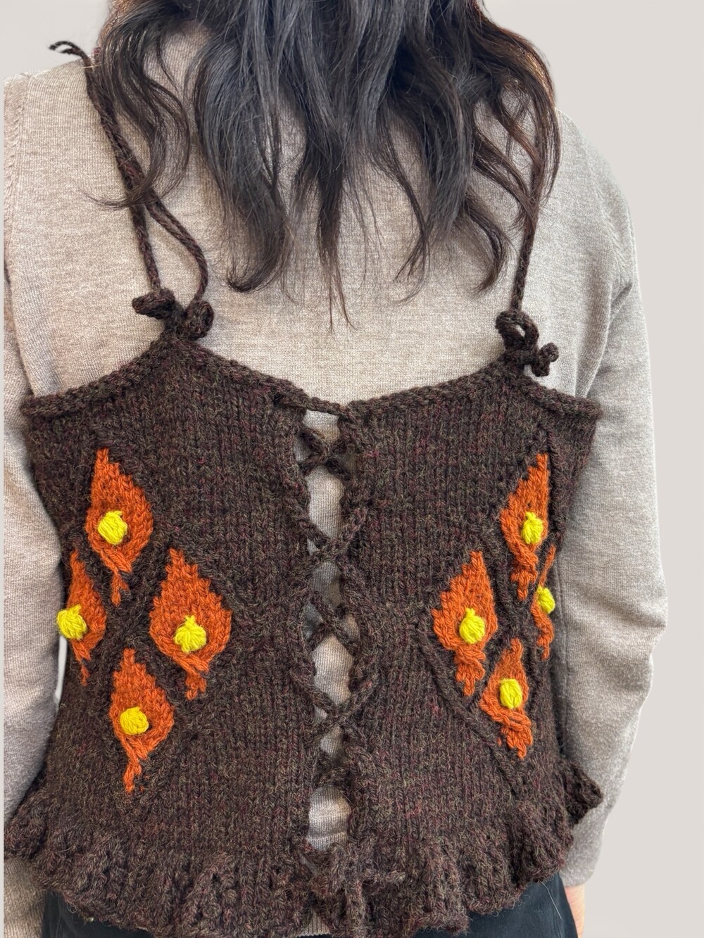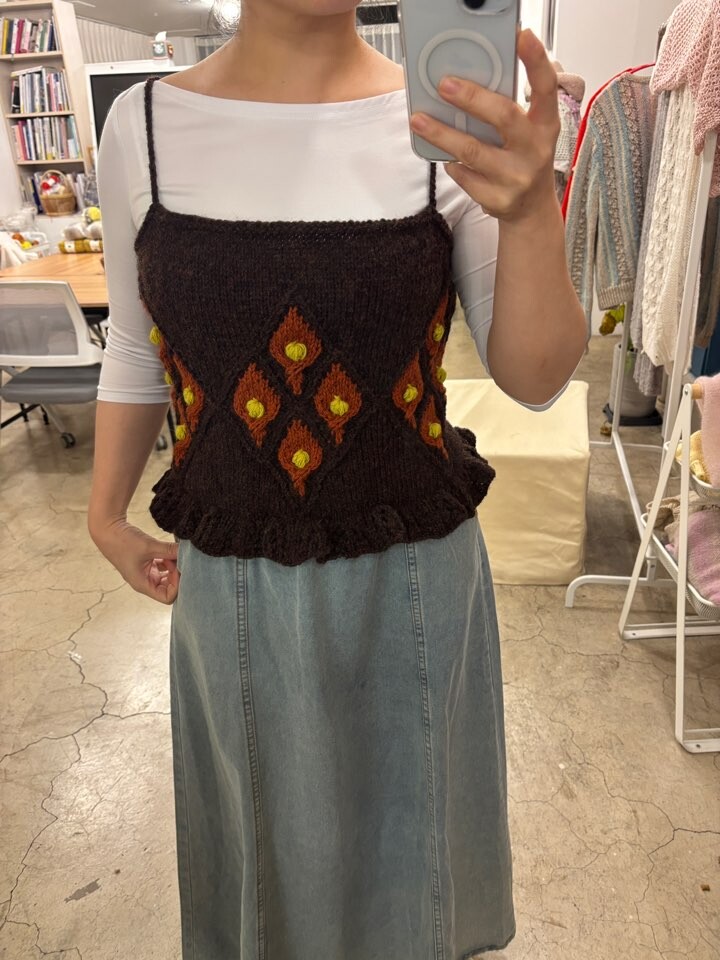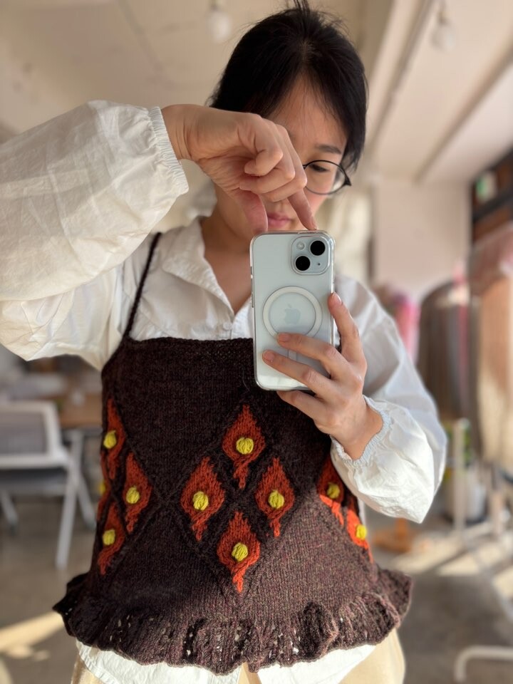 풀오버를 뜰 계획으로 스와치를 떠 본 후 스와치의 모양에서 영감을 얻어 캐미솔이 만들어졌습니다.