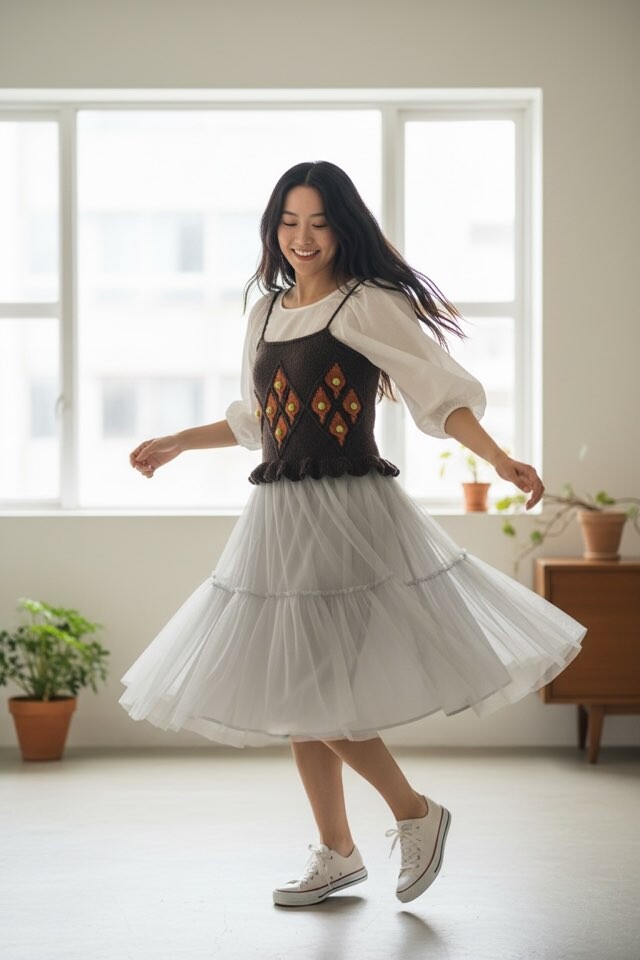 사이드 다트를 넣어 바스트 라인을 예쁘게 만들어주고 아랫단은 프릴로 장식해서 여성스럽고 귀여운 느낌입니다.