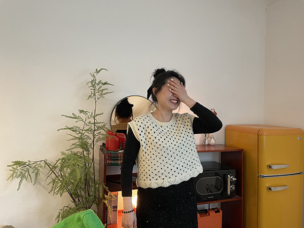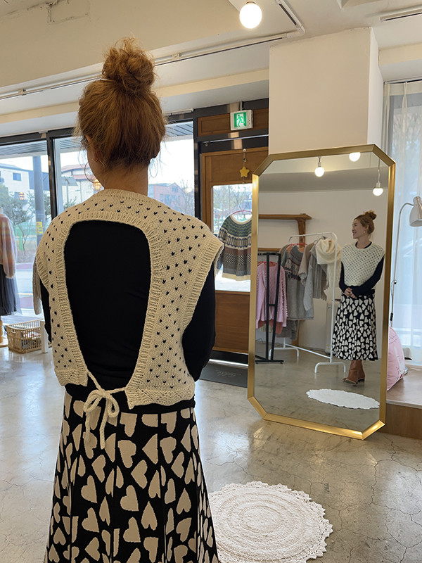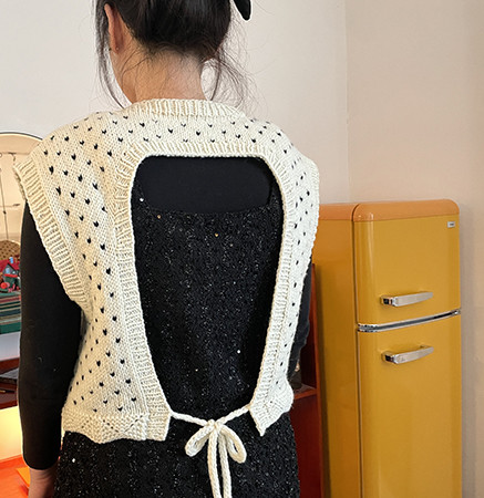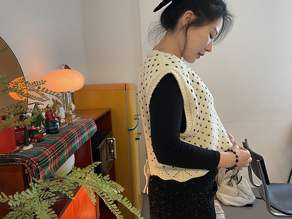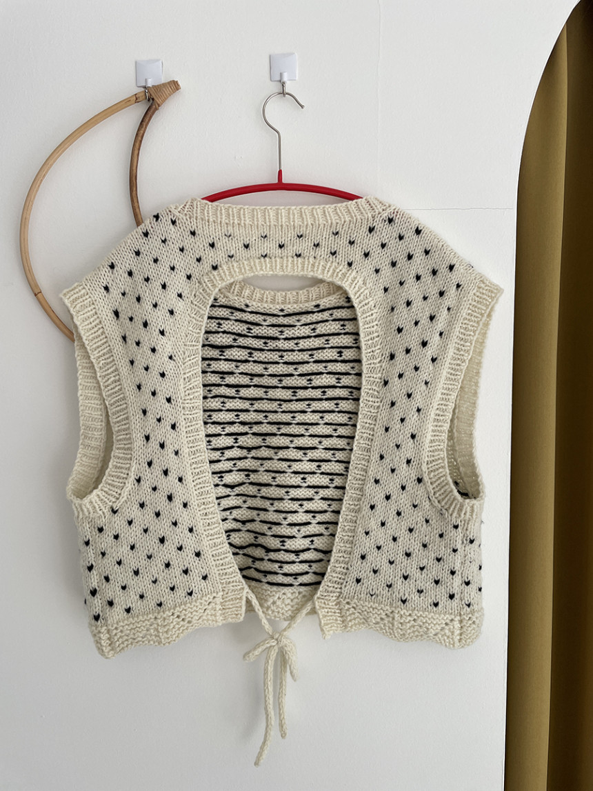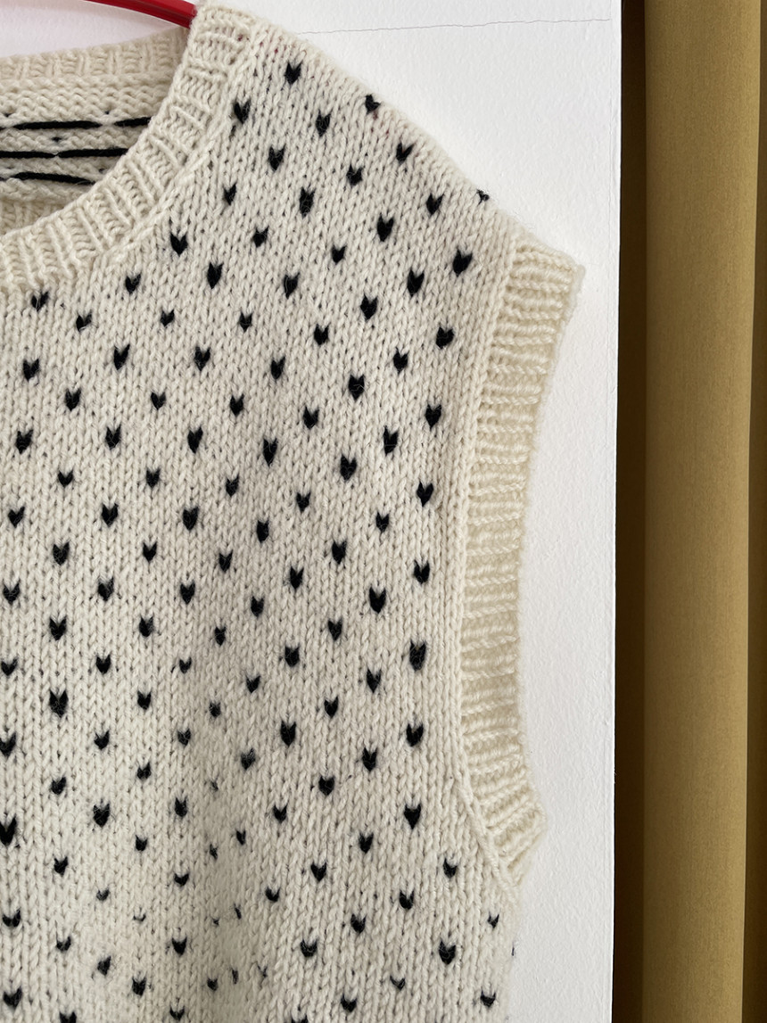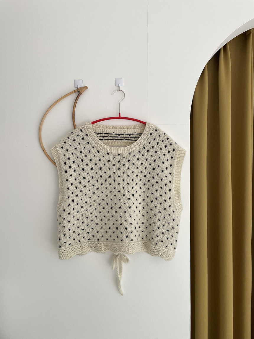 배색실 한 코의 하트가 포인트로 전체적으로 귀여우면서 뒤판의 파격적인 트임이 있는 베스트입니다.