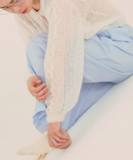 모헤어와 같은 컬러의 구슬뜨기도 디자인도 포인트이예요.